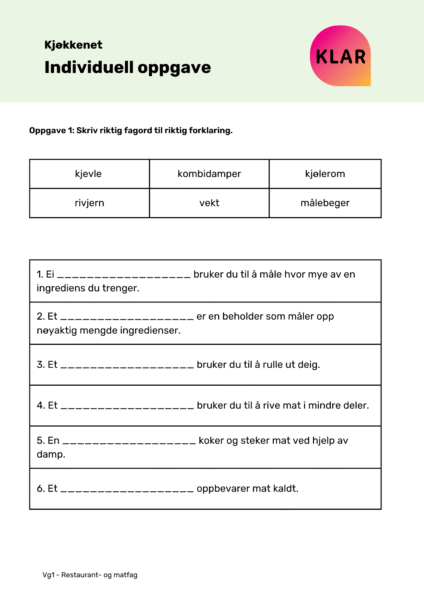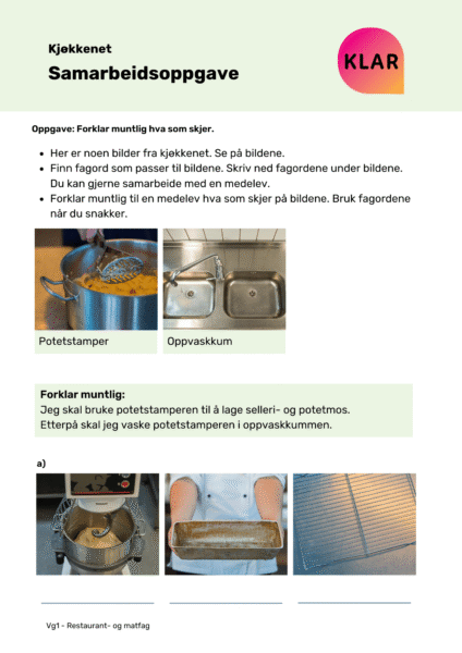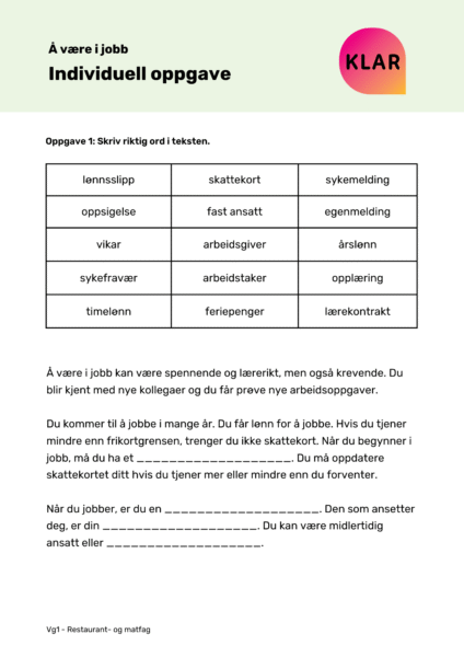 KLAR ressursbank er en digital verktøykasse for lærere, veiledere og oppfølgingsansvarlige. Her finner du fiks-ferdige undervisningsopplegg og veiledere til hvordan du kan komme i gang med KLAR app, samt jobbe med yrkesretta norskopplæring.
