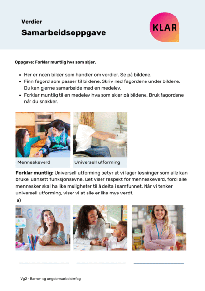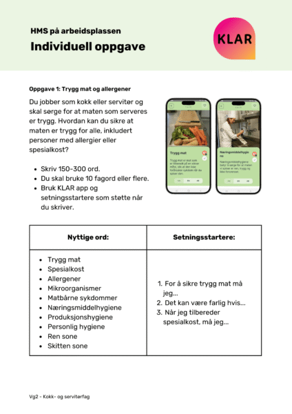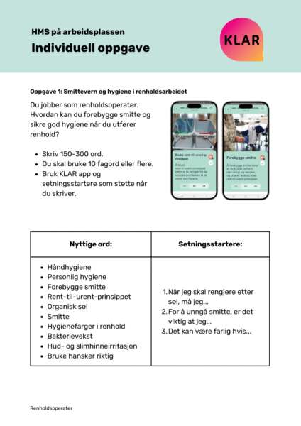 KLAR ressursbank er en digital verktøykasse for lærere, veiledere og oppfølgingsansvarlige. Her finner du fiks-ferdige undervisningsopplegg og veiledere til hvordan du kan komme i gang med KLAR app, samt jobbe med yrkesretta norskopplæring.