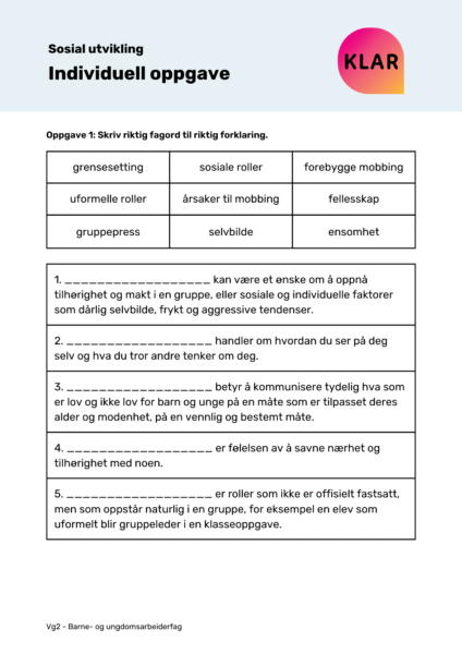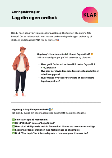 KLAR ressursbank er en digital verktøykasse for lærere, veiledere og oppfølgingsansvarlige. Her finner du fiks-ferdige undervisningsopplegg og veiledere til hvordan du kan komme i gang med KLAR app, samt jobbe med yrkesretta norskopplæring.