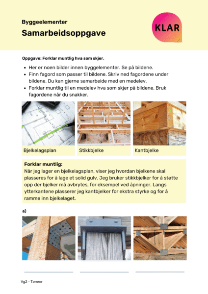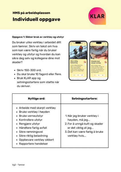 KLAR ressursbank er en digital verktøykasse for lærere, veiledere og oppfølgingsansvarlige. Her finner du fiks-ferdige undervisningsopplegg og veiledere til hvordan du kan komme i gang med KLAR app, samt jobbe med yrkesretta norskopplæring.