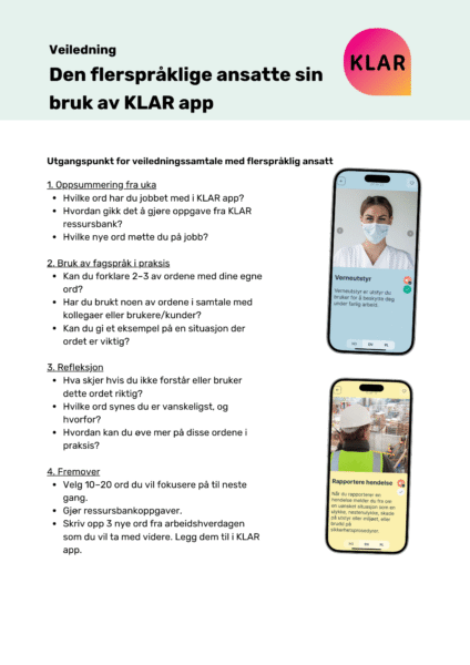 KLAR ressursbank er en digital verktøykasse for lærere, veiledere og oppfølgingsansvarlige. Her finner du fiks-ferdige undervisningsopplegg og veiledere til hvordan du kan komme i gang med KLAR app, samt jobbe med yrkesretta norskopplæring.